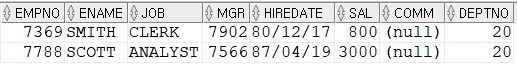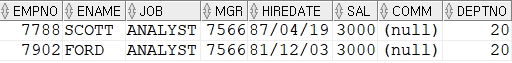 즉 사원 이름 중에 두번째 문자가 L인 데이터를 가리키게 된다. 위 예제의 결과를 살펴보면 EMP테이블에서 사원 이름 열의 데이터 중 두번째 문자가 'L'인 ALLEN, BLAKE, CLARK데이터가 조회되었음을 확인 할 수 있다.