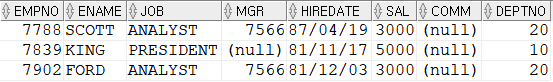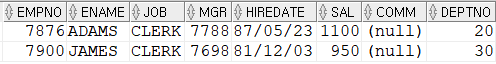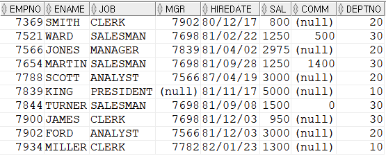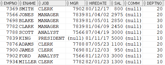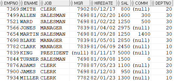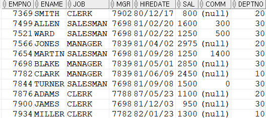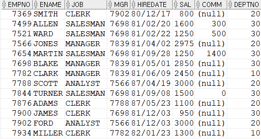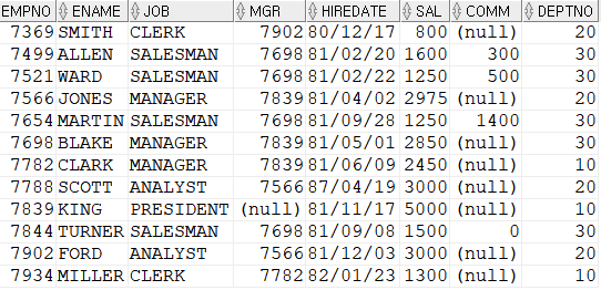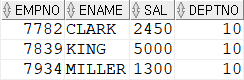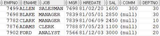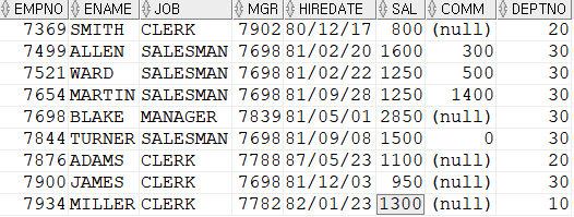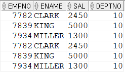 SELECT EMPNO, ENAME, SAL, DEPTNO