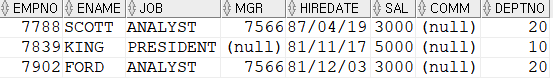 이번에는 위와 반대의 경우를 생각해보자. 직책 열 값이 MANAGER도 아니고, SALESMAN,CLERK도 아닌 데이터를 찾을 때 앞에서 배운 등가 비교 연산자와 AND연산자를 사용하여 세 값이 모두 아닌 데이터를 찾기 위해 SELECT문을 다음과 같이 작성할 수 있다.
