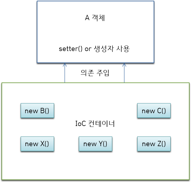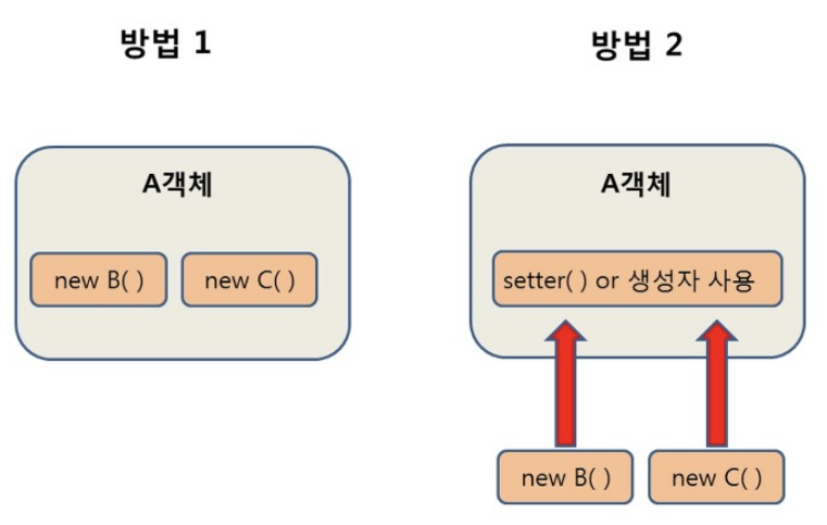 다른 객체를 사용하기 위해서는 사용하려는 A객체가 B, C객체를 직접 생성하여 사용할 수도 있고, 미리 만들어져 있는 것을 할당받아서 사용할 수도 있다.