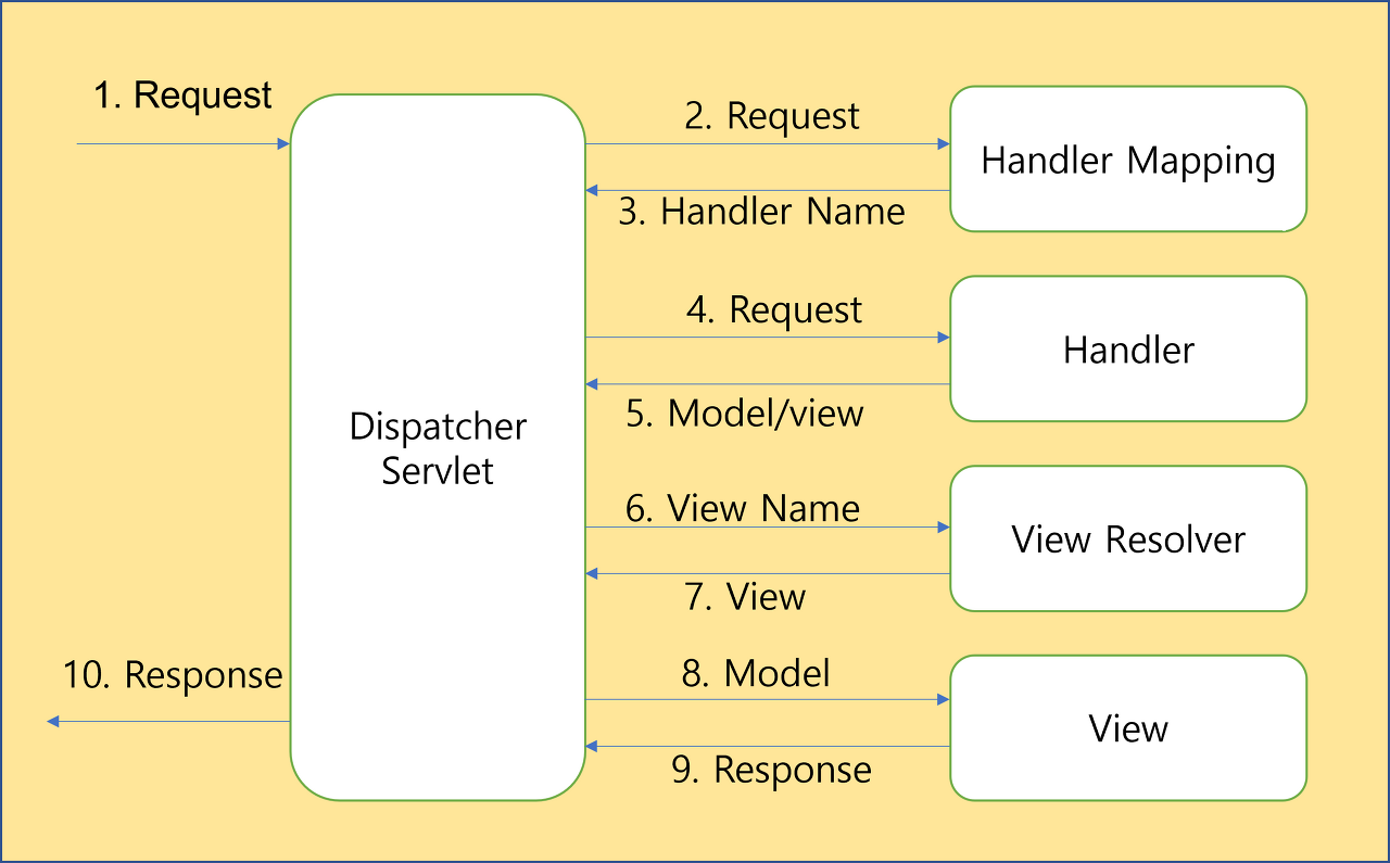 스프링 MVC는 DispatcherServlet, View Resolver, Handler, View 등으로 구성되어 있다.