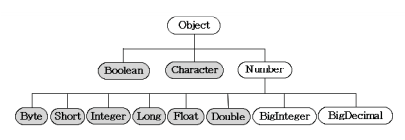 이 클래스는 추상클래스로 내부적으로 숫자를 멤버변수로 갖는 래퍼클래스의 조상이다. 아래의 그림은 래퍼클래스의 상속계층도인데, 기본형 중에서 숫자와 관련된 래퍼 클래스들은 모두 Number클래스의 자손이라는 것을 알 수 있다.